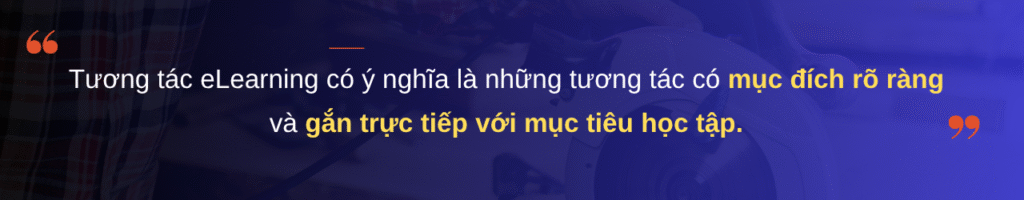 Những tương tác eLearning có ý nghĩa là những tương tác có mục đích rõ ràng và gắn trực tiếp với mục tiêu học tập. Chúng thúc đẩy sự tham gia về mặt nhận thức bằng cách tạo cơ hội cho người học áp dụng kiến thức, giải quyết vấn đề, đưa ra quyết định hoặc thực hành kỹ năng.