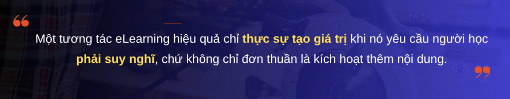 Tuy nhiên, dưới góc độ thiết kế eLearning, chỉ riêng việc nhấp chuột không làm cho một tương tác trở nên có ý nghĩa. Một tương tác eLearning hiệu quả chỉ thực sự tạo giá trị khi nó yêu cầu người học phải suy nghĩ, chứ không chỉ đơn thuần là kích hoạt thêm nội dung.